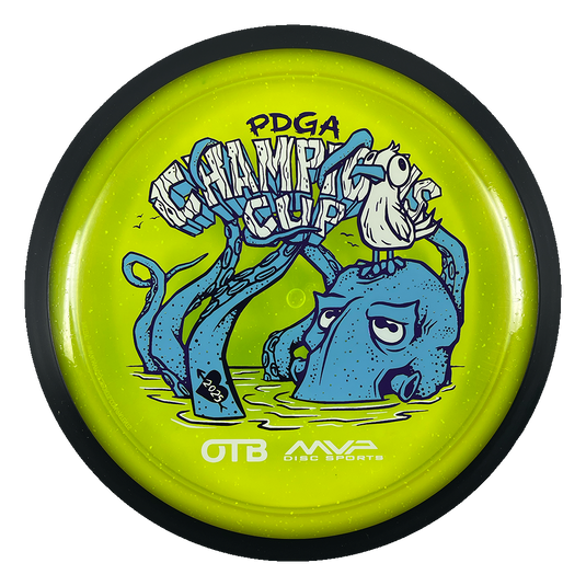 "Frank", courtesy of Green C Studio, on the Particle Glow Proton Wave! Blending seamlessly into the plastic, Frank adorns this neutral to understable distance driver ready to be a lower-power bomber, hyzerflip machine, or even a roller disc. Now available in our Particle Glow Proton, you can light up the fairway in style - just like Frank.